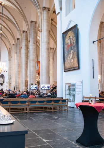 Het podium voor dit concert hadden we deze keer tegen de ingang van het Koor (kapel van de kerk) opgebouwd waarna de banken gericht naar het podium zijn gezet. Gasten konden genieten van een hapje en drankje bij de cateringhoek.