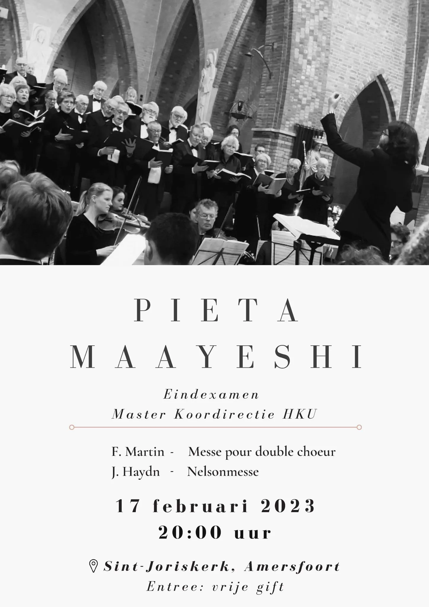 Op 17 februari om 20:00 uur geeft Pieta Maayeshi haar eindexamenconcert. Hiermee studeert ze af van haar studie koordirectie Master of Music aan het conservatorium in Utrecht bij hoofdvakdocent Rob Vermeulen.