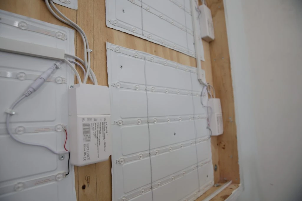 Het glas-in-lood is geïnstalleerd op een houten lijst waarbij led-lampjes de achterzijde kunnen verlichten. Daardoor geeft het kunstwerk een prachtige veelkleurig licht af.