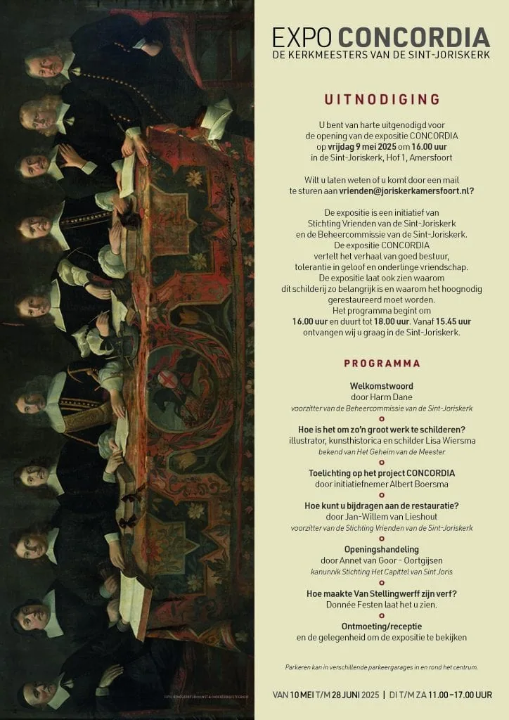 U bent van harte uitgenodigd voor de opening van de expositie CONCORDIA op vrijdag 9 mei 2025 om 16.00 uur. De expositie is een initiatief van Stichting Vrienden van de Sint-Joriskerk en de Beheercommissie van de Sint-Joriskerk. De expositie CONCORDIA vertelt het verhaal van goed bestuur, tolerantie in geloof en onderlinge vriendschap. De expositie laat ook zien waarom dit schilderij zo belangrijk is en waarom het hoognodig gerestaureerd moet worden.