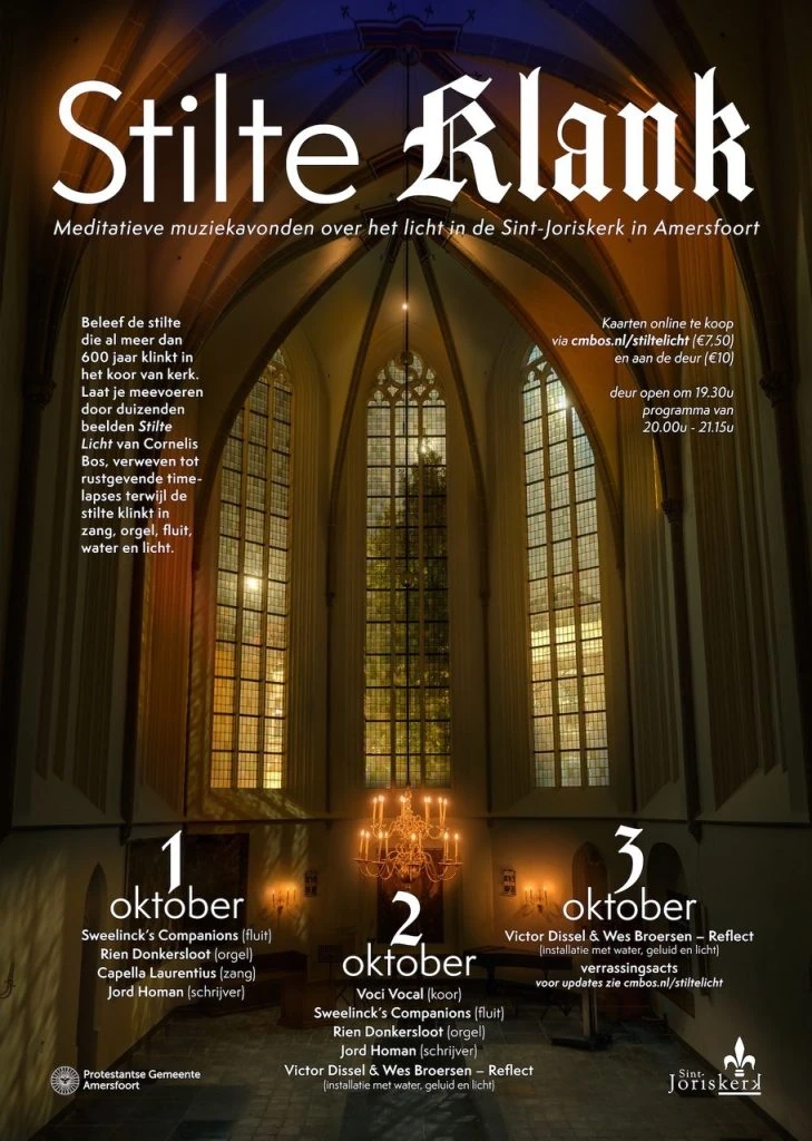 Beleef de stilte die al meer dan 600 jaar in het koor van de Sint-Joriskerk in Amersfoort klinkt. Drie avonden zal de stilte op diverse manieren klinken. Laat je meevoeren door duizenden beelden uit Stilte Licht van Cornelis Bos, vervlochten tot rustgevende timelapses.