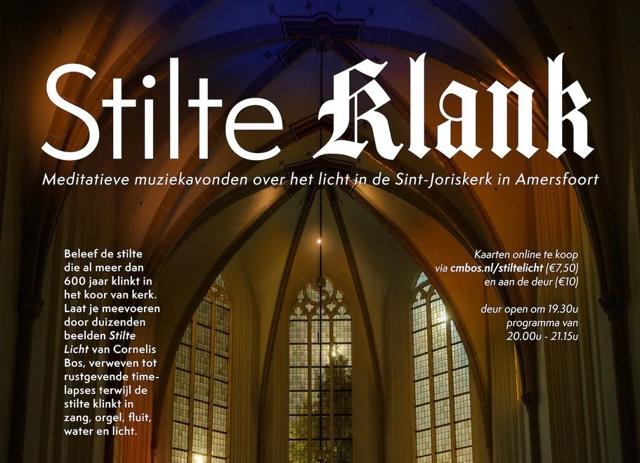 Beleef de stilte die al meer dan 600 jaar in het koor van de Sint-Joriskerk in Amersfoort klinkt. Drie avonden zal de stilte op diverse manieren klinken. Laat je meevoeren door duizenden beelden uit Stilte Licht van Cornelis Bos, vervlochten tot rustgevende timelapses.